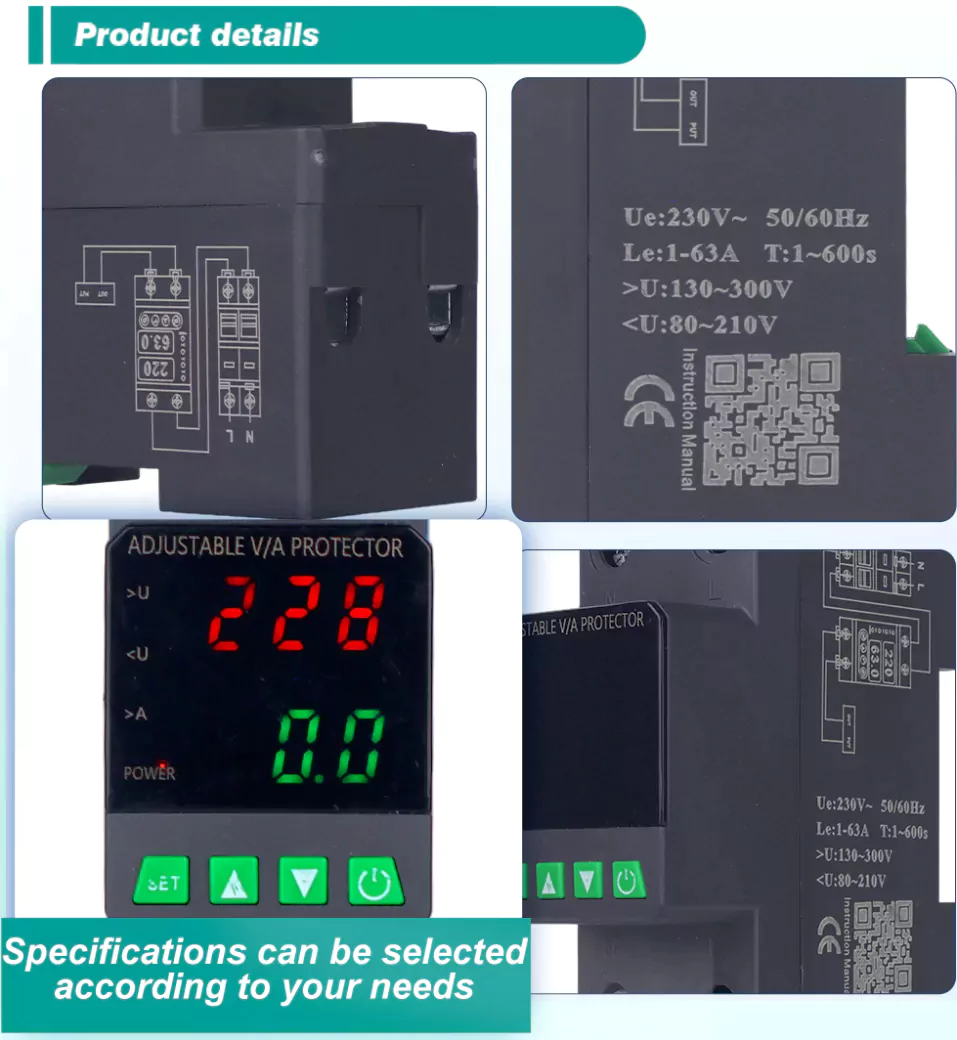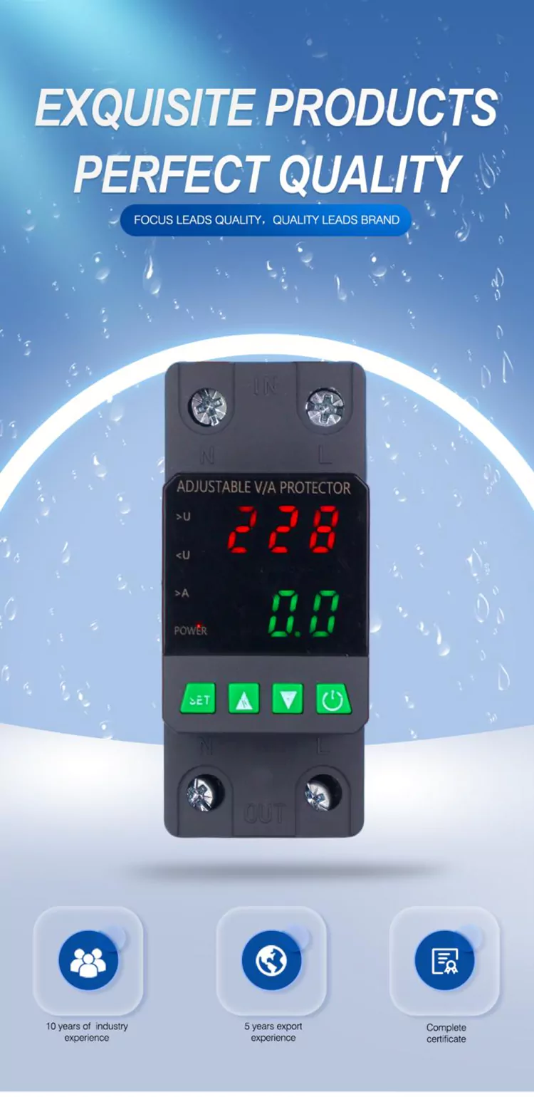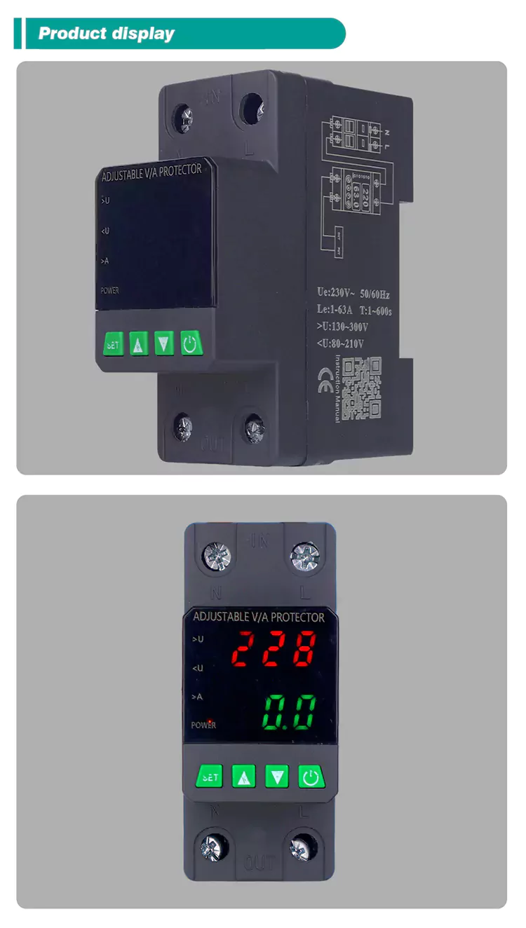 Снабден с цифров дисплей и произведен с внесени модулни електронни компоненти, той има висока надеждност и производителност. Протекторът автоматично и бързо отрязва захранването по време на ненормални напрежения (като пренапрежение, подпредване или колебания на мрежата) и възстановява захранването, след като напрежението се върне към нормалното.