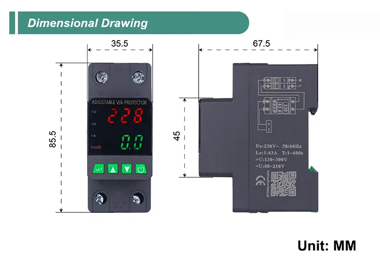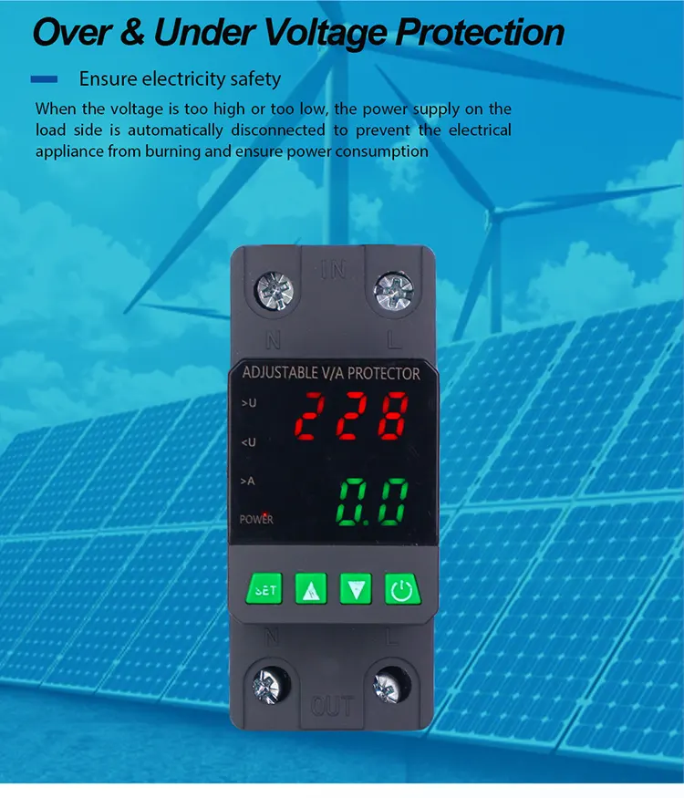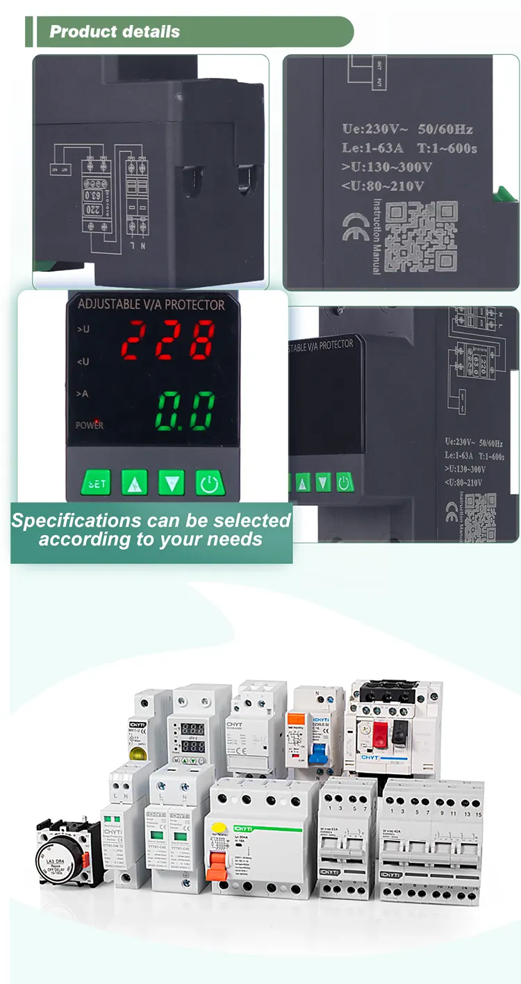 Снабден с цифров дисплей и произведен с внесени модулни електронни компоненти, той има висока надеждност и производителност. Протекторът автоматично и бързо отрязва захранването по време на ненормални напрежения (като пренапрежение, подпредване или колебания на мрежата) и възстановява захранването, след като напрежението се върне към нормалното.